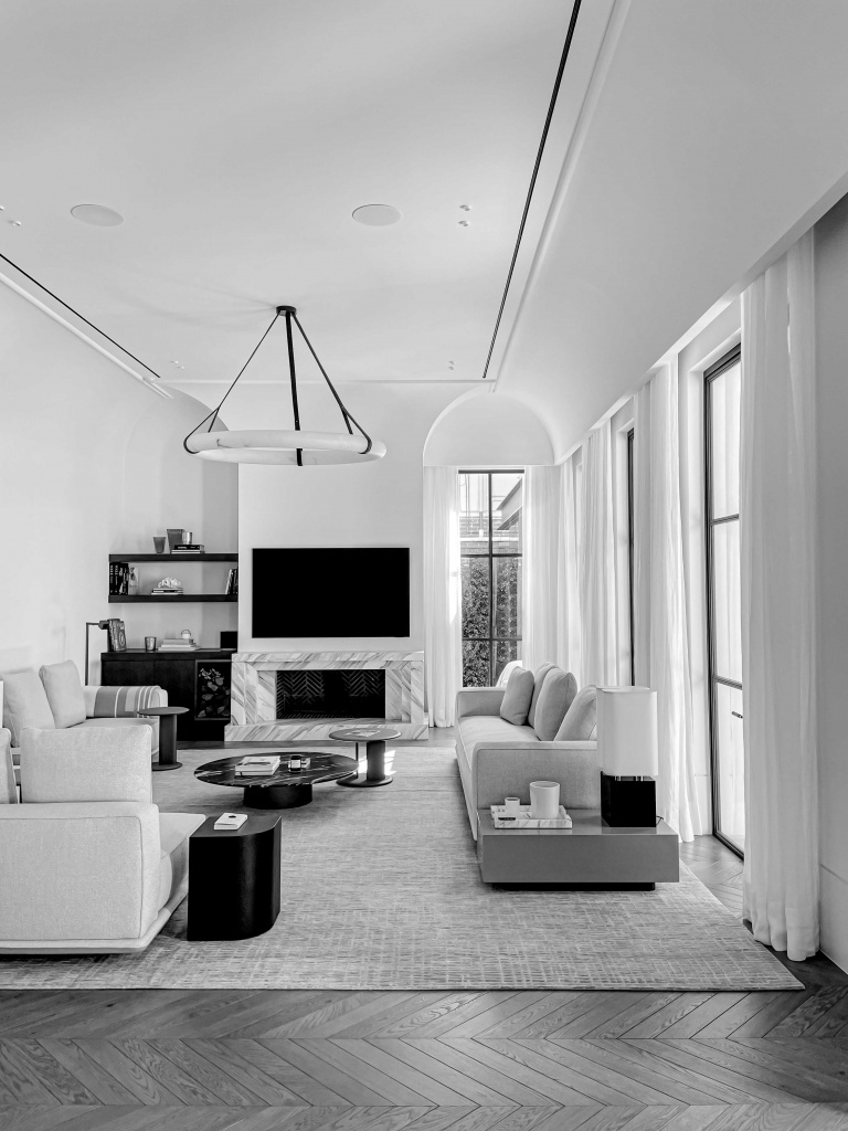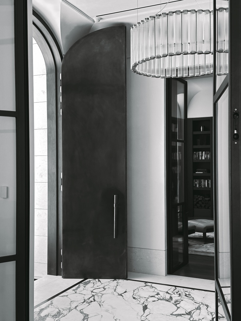 Reflective of director Paul’s signature design ethos, the home presents formal architectural motifs at the front; a dramatic metal door opens onto a grand foyer that continues down a linear hallway with private formal rooms either side, converging to the public living spaces revealing an open and contemporary expression.